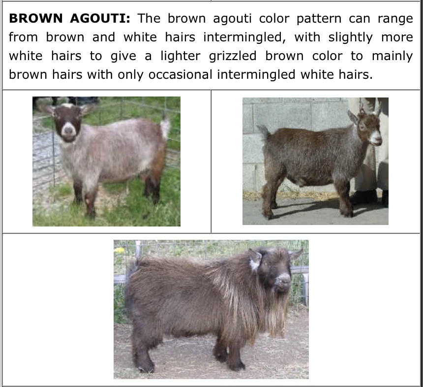 يأتي بلون البني الاغوطي درجات فاتحه تسمى لايت ابراون وتظهر درجه هذا اللون بتداخل الشعر الأبيض من الشعر البني وتأتي معالم الجسم باللون البني من معصم الأرجل ولون الوجه في درجات الفاتحه وبين درجة اللون الغامق والفاتح تأتي درجة اللون المتوسط.
